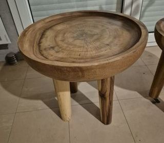 Table entièrement neuve en bois de Caféier très résistant et lourd, exemplaire unique introuvable dans le commerce. Diamètre 50 cm Hauteur 47cm Pieds Ø 5 cm A venir chercher su