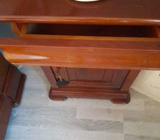 Lit bateau 2 places avec sommier a lattes et chevet, en merisier massif. Possibilité de mettre un sommier tapissier. Très bon état. Le lit mesure 146x200 et le chevet 49x34, 65cm