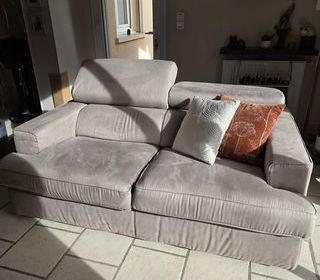 2 canapés 2 places Poltronesofa (beige/taupe) en très bon état. Revêtement en tissu. Dimensions : 94 x 171 x 108 avec mécanisme dans les appuis têtes Ils sont entièrement déhou