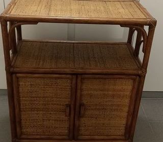 VENDS MEUBLE ROTIN PIN MIEL. ETAT NEUF .RARE, CAR PLUS FABRIQUE . UNE ETAGERE CENTRALE, UN PLATEAU SUPERIUR ,UN COMPARTIMENT BAS AVEC 2 PORTES ,LE TOUT ASSEMBLE AVEC DES LIANES POU
