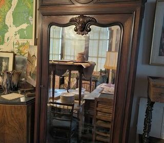 porte miroir, placage acajou, 2 tiroirs hauteur 2m44 largeur 1m profondeur 43