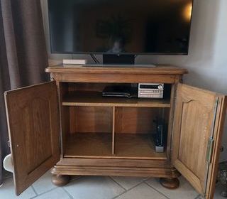 Meuble fait par un ébéniste et en très bon état. Le meuble est fait en chêne massif et le panneau arrière en châtaignier. Dimension : longueur 90 cm/largeur 47.5 cm/hauteur 83 cm
