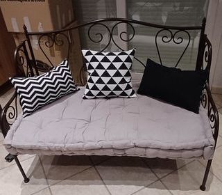 banquette en fer forgé marron vendue avec matelas gris et coussins très bon etat