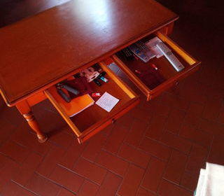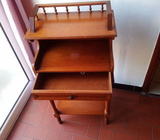 Petit meuble/console servait à poser le téléphone et la box. En bon état. En bois vernis. Un tiroir. Dimensions Hauteur 91 cm x profondeur 30 cm x largeur 43 cm.