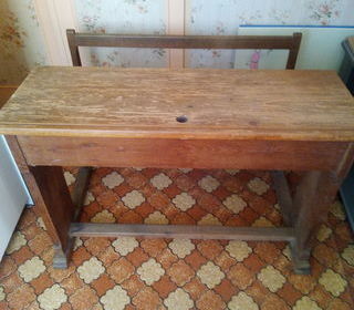 Bureau écolier ancien, en bois Massif. Double assises. 2 casiers de rangement. Emplacement encrier. En très bon état. Dimension : largeur 110 cm, hauteur 75 cm, profon