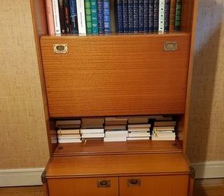 secrétaire bureau Vintage, style années 70. 4 parties : - partie haute avec étagère pour livres ou bibelots - partie centrale avec bureau à abattant et une étagère à l'intérieu
