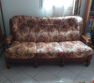 Canapé convertible trois places avec un revêtement imprimé floral et une structure en bois. Très bonne assise. En tres bon état. Coussins pratiquement neufs très peu servi. Mes