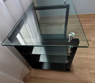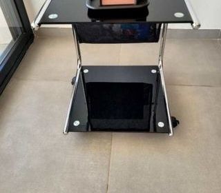 Table d'appoint pouvant servir de bout de canapé pour poser les télécommandes ou autres. Avec 2 plateaux en verre trempé noir et entourer de métal chromé et porte revue. Remise e