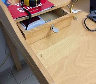 Bureau en hêtre clair, ayant un certain charme et attractif, design agréable tout en étant fonctionnel, muni de deux tiroirs en surface avec clés. H 75 P 60 L 110