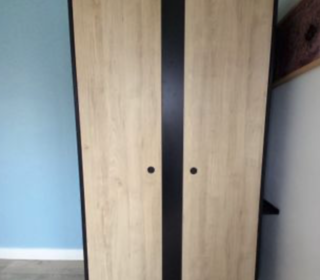Armoire moderne/garde-robe en bois dotée de deux portes état neuf (2025), design moderne avec façade principale en bois clair et bande centrale noire. Equipée de poignées encastrée