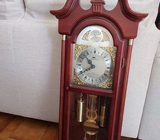 en bois , teinté chene , fonctionne par pile , trés bon état , L : 30 cm h : 60cm P : 12 cm