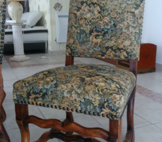 jolies chaises de salle a manger style louis xiii boiseries de qualités ,tapisserie représentant chasses a coure cloutes assise a revoir
