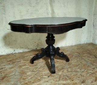 Table Napoléon III violoncelle, en bois noir avec des nuances marron, dessus marbre blanc, deux tiroirs, un petit choc sur un bord, Long:1.16 L.0.72 H: 0.74, à récupérer à LIMOUX