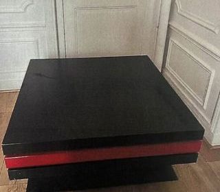 jolie table CINNA ouvrable sur 3 plateaux latérales bois wengé brun et rouge. dimensions 80cmx80cm sur 36cm de haut se modifie selon l'envie ou l'espace de sa pièce en ouvrant un
