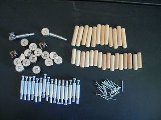 Sachet comprenant : - 18 goujons à viser de mm - 18 roues excentrique - 28 pointes clous de mm de long - 16 tourillon en bois de mm sur mm - 12 tourillons de bois de
