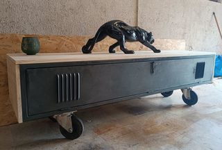 Meuble TV réalisé à partir d'un ancien vestiaire de type industriel. Dimensions : L 1885 P 500 H 540 Meuble sur grandes roulettes. Un passage de câbles est aménagé au fond af