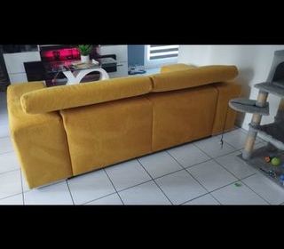 Vend canapé moutarde ( pas convertible), repose tête inclinable,pied chromé, un pouf compris Dimensions 2m20L x 1m10 L x80cm H x 40 assise