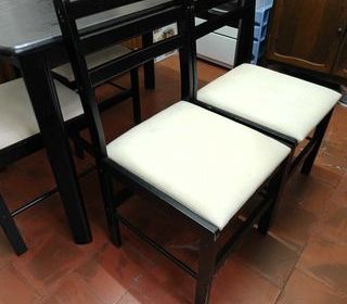 Je vends cette table noire de salle à manger avec 4 chaises avec assise beige assorties. Les assises sont légèrement tachées. L130xl75xH75 - Type de produit : Table de salle à m