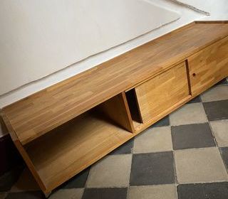 Meuble TV en chêne massif abouté et huilé marque HIBA Dimensions 150x 40x40 Pieds acier noir ou roulettes A emporter à BEZIERS