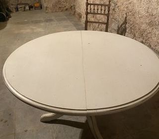 Table ronde tripode finition peinture blanche patinée à l'ancienne Diamètre 120 cm Peut recevoir deux rallonges 8/10 personnes En bon état