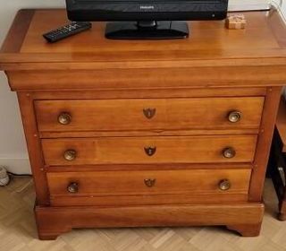 Commode avec 4 tiroirs en bon état ; Hauteur : 85 cm largeur : 1 m profondeur : 45 cm A venir chercher