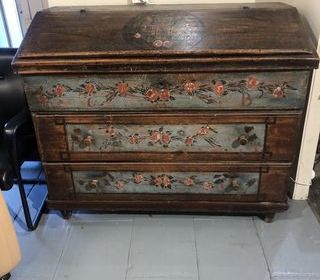 Rare et magnifique bureau de pente scriban de sacristie en mélèze avec de riches motifs peints ,daté 1856 avec abattant retenu par chaines,petits tiroirs intérieur et 2 grand