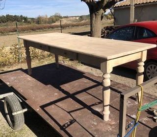 Grande table ancienne en pin sablé et blanchi avec 2 tiroirs en ceinture .230 X 90 X 77 Cette table a été traitée par un professionnel avec traitement imperméable anti taches fa