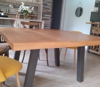 Table carrée 8 personnes unique fabriquée sur mesure par un ébéniste. 4 pieds de 8/8 cm par un ferronnier plus une rallonge de 60 cm ( 4 convives sup) Dimensions: 140/140 cm E