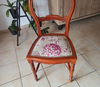 4 chaises en merisier massif, assise en tissu. Hauteur de la chaise: 94 cm, hauteur jusqu'à l'assise: 45 cm Pas de livraison, remise en mains propres