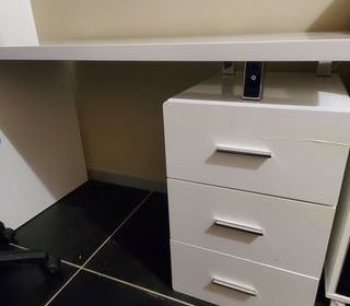 Mesures :120 L × 55 l x 76 H Laqué blanc , 3 tiroirs, moderne Démontable en 2 parties. Chaise modulable à roulettes bleue. A récupérer sur place .