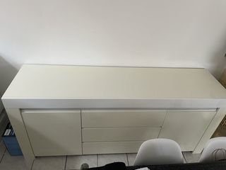 Buffet blanc laqué avec grands tiroirs, prévoir un nettoyage car jaunît avec le temps mais reste en très bon état, s'allume sur le devant. Longueur 190cm Profondeur 50cm