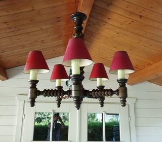 Lustre bois, style Basque, 5 branches avec ses ampoules et abat-jour.