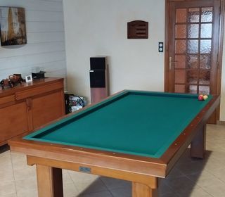 Vends billard français René Pierre modèle Olympic, non chauffé, 2.40 * 1.33 m, cadre métallique, ardoises 30 mm en 3 parties, drap Simonis 300 vert n°3, jeu de billes super aramith
