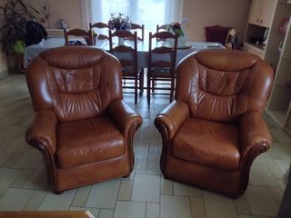 lot de 2 fauteuils cuir moulure bois sculpté bon état