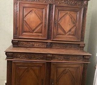 Superbe buffet 2 corps en noyer et chêne Cabinet Louis XIII Richesse ornementale. Des profondes moulures soulignent les montants, les portes et les corniches A décor de têtes d'