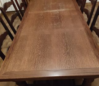 Table de salle à manger et chaises Table de 180 cm de long et 90 cm de large, épaisseur plateau 4,5 cm complétée de 2 allonges 6 chaises paillées, dossier haut Chêne massif B