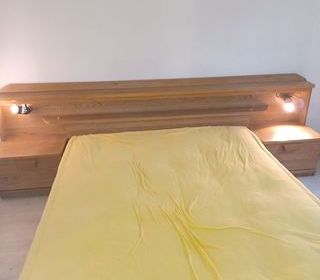 chambre à coucher comprennt Armoire brun foncé avec miroirs. 2 portes avec une finition en vernis brillant. 1 côté penderie - 1 côté étagère Il y a 1 chevet et 1 lit 140 x 190
