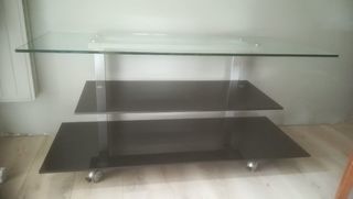 meuble télé hi fi piètement métallique et 3 tablettes verre tablette supérieure transparente 50 cm x 120 cm tablette intermédiaire noire 40 cm x 90 cm tablette inférieure noir