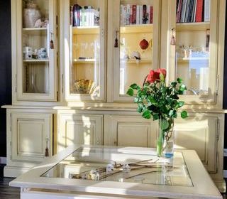 cause déménagement, vends vaisselier-bibliothèque artisanal (meubles coup de soleil) en parfait état, en chêne couleur tilleul usé en extérieur et ivoire patiné en intérieur,4 port