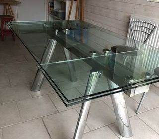 Table rectangulaire en verre épaisseur 1 cm, sur 4 pieds chromés. Plateau faisant 160 x 90 cm, avec 2 rallonges chacune faisant 40 cm, à chaque extrémité de la table, pour 8/10 pe