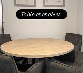 Table ronde en bois clair avec piétement noir, accompagnée de 4 chaises rembourrées foncées kaki à structure noire
