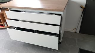 Caisson de rangement mobile avec trois tiroirs spacieux, de couleur blanche. Le dessus est en bois de couleur claire, ajoutant une touche de chaleur au design moderne. Le caisson e