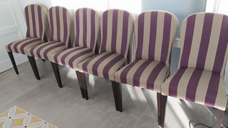 VENT LOT DE SIX CHAISES REVETEMENT EN TISSU COULEUR TAUPE ET LILAS TRES BON ETAT GENERAL .