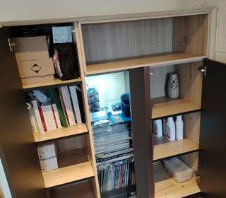Meuble solide en bois foncé, sur roulettes, avec portes vitrées. Dimensions : 40 cm x 40 cm x 88 cm de hauteur. Conçu pour ranger CD, livres etc. En très bon état et robuste.