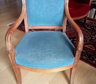 Fauteuil de style en bois et tissus bleu en très bon état. A prendre sur place. Contact uniquement par tel.