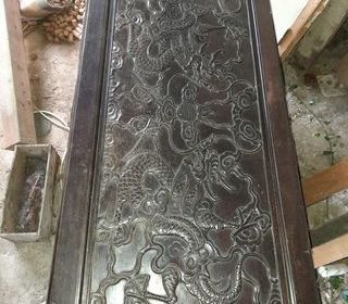 Table en bois avec plateau décoré de motifs sculptés représentant un dragon. L'objet présente une teinte foncée et une structure rectangulaire.