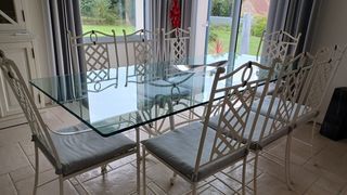 Table 8 personnes, 2 fauteuils et 6 chaises en fer forgé, provenance Italie atelier environs de Venise, en très bel état. Mobilier pouvant s'intégrer dans un environnement moderne.