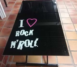 Table extensible en verre noir avec impression dim 1m10x60 hauteur de 35cma 74 cm a prendre à domicile