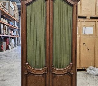 Magnifique bibliothèque en chêne massif, au style classique et raffiné Louis XV/Rocaille. Elle se distingue par ses portes ornées de sculptures et ses panneaux grillagés en tissu v