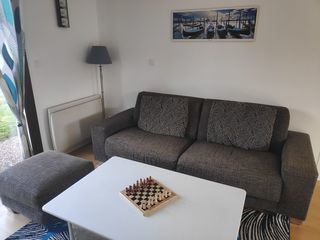 Je vends un canapé 4 places avec pouf et 2 coussins en tissu noir chiné et pieds chromé. Dimensions du canapé 225x97xht80 Pouf 60x60xht40 Ensemble en très bon état.